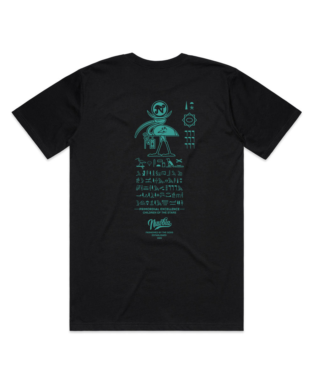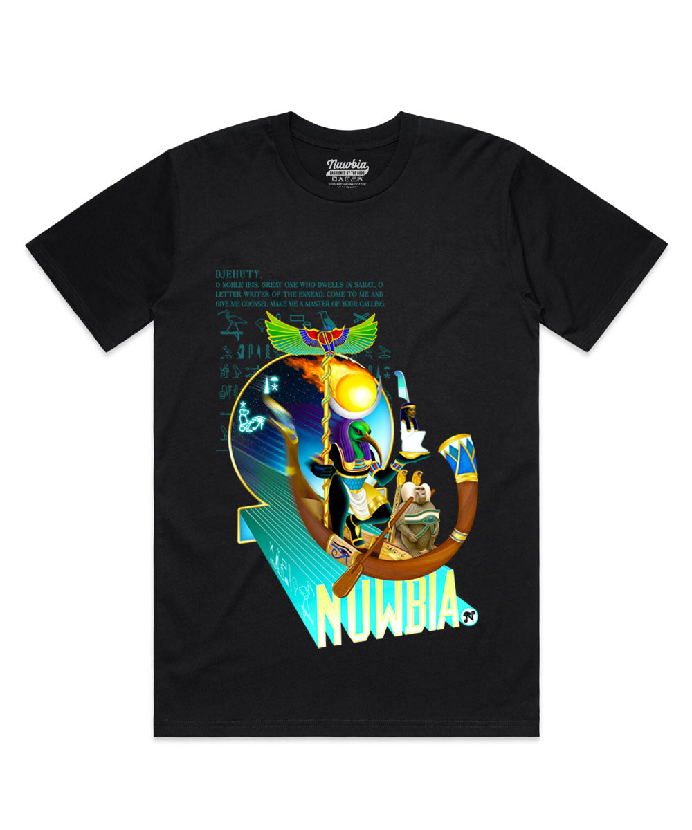 Introducing the "Tehuti Emerges" Black T-shirt — a radiant homage to Djehuty (Thoth), the great keeper of wisdom, divine scribe of the Neteru, and master of cosmic order. This design captures the sacred moment where Tehuti rises from the Nun aboard the Mandjet boat of a million years, carrying forth Maat — truth, justice, and balance — into creation itself.
