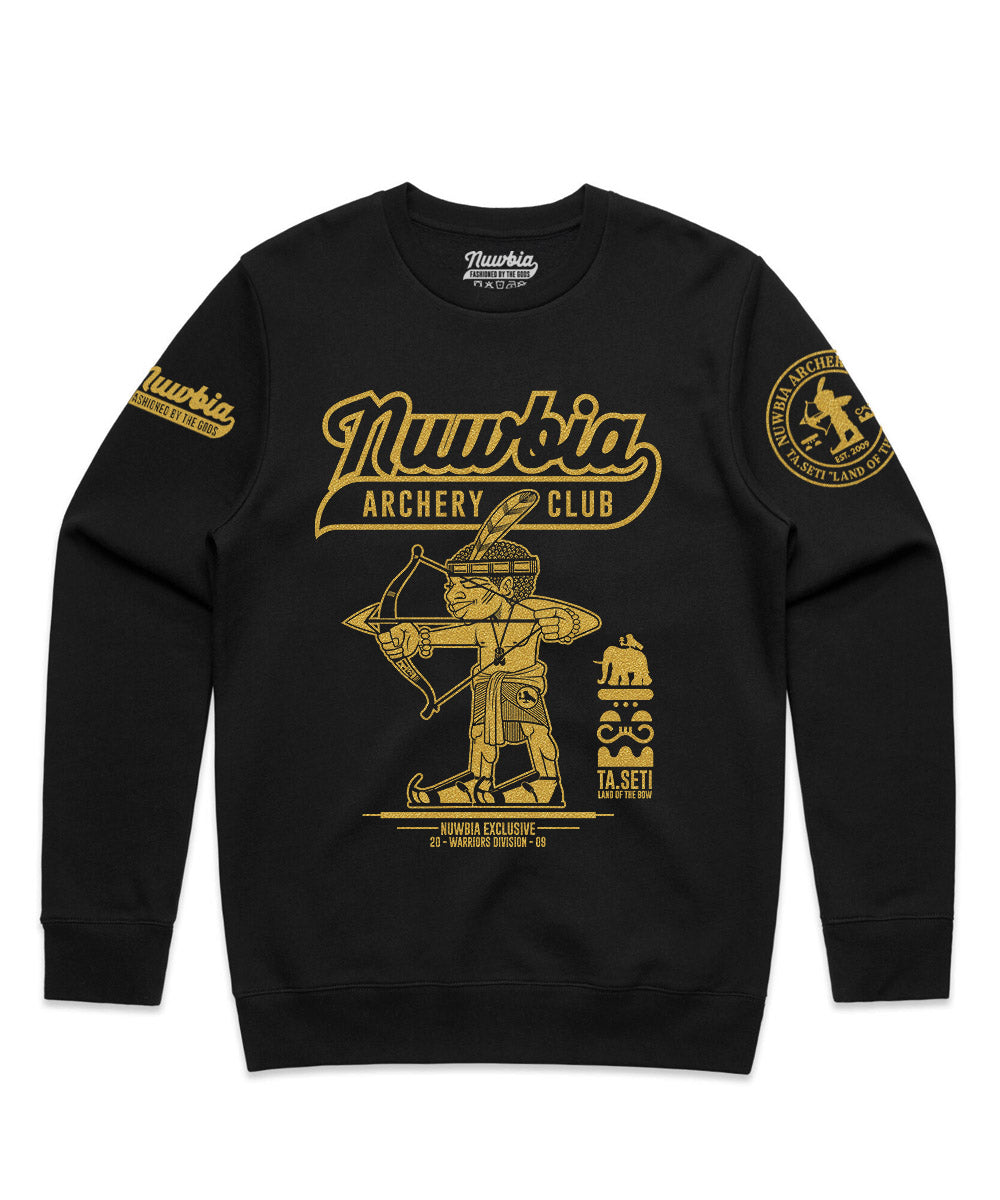 Step into the legacy of the ancient Kushite warriors with this striking Nuwbia Archery Club sweatshirt. Crafted in rich black fleece and printed in radiant metallic gold, this piece honors the legendary marksmen of Ta-Seti - 𓇾𓏏𓏏𓐮𓈉 The “Land of the Bow.”