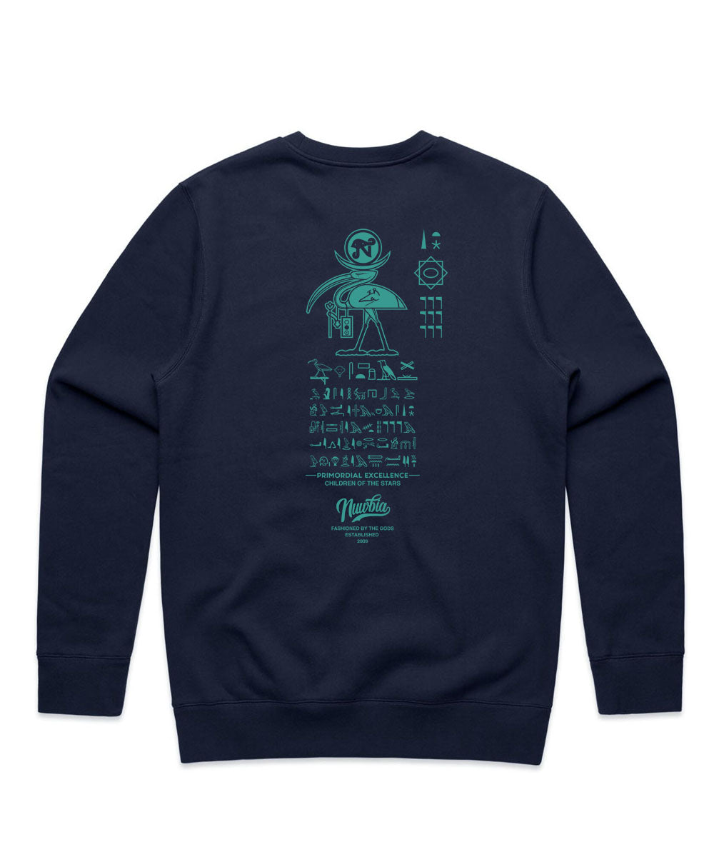 Introducing the "Tehuti Emerges" Navy Blue Crewneck — a radiant homage to Djehuty (Thoth), the great keeper of wisdom, divine scribe of the Neteru, and master of cosmic order. This design captures the sacred moment where Tehuti rises from the Nun aboard the Mandjet boat of a million years, carrying forth Maat — truth, justice, and balance — into creation itself.