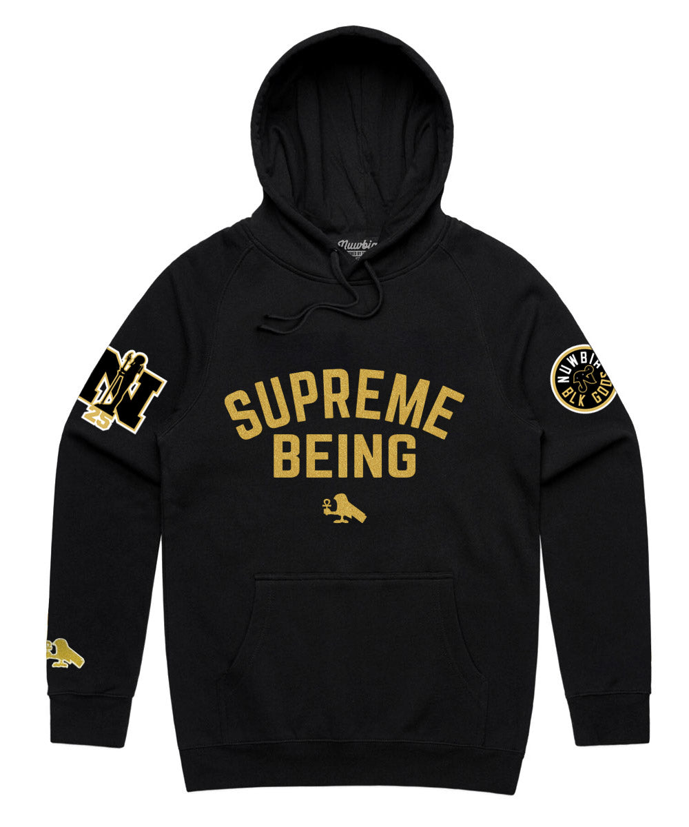 Crafted from a premium mid-weight cotton/poly blend, this hoodie delivers the perfect balance of comfort, structure, and durability. The rich black base serves as a powerful canvas for the bold gold SUPREME BEING typography, symbolizing elevated consciousness, self-mastery, and ancestral power.